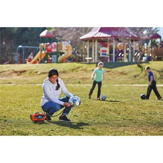 The BLACK+DECKER 20V MAX* Lithium Ion multi-purpose inflator handle inflation needs anywhere. The three power sources allow for inflation inside the home, on the road, or in the backyard. Its high-volume output quickly fills larger inflatables like rafts and air mattresses. Plus, the deflate function rapidly empties the air for quick clean up. The high-pressure output inflates tires and sport balls. Complete with a digital pressure gauge and automatic shutoff technology, this inflator brings set-it and forget-it peace of mind.