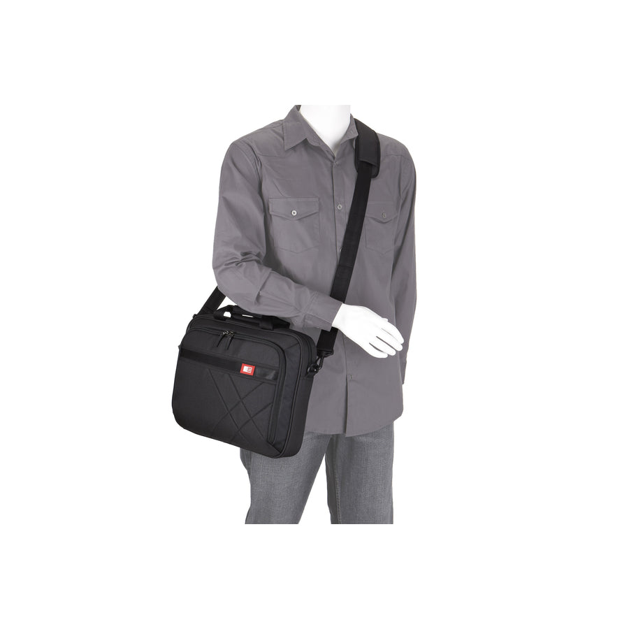 Modernized for today's casual professional, this asymmetrically quilted case carries a laptop, tablet and your business needs within a deep black exterior highlighted with red accents.