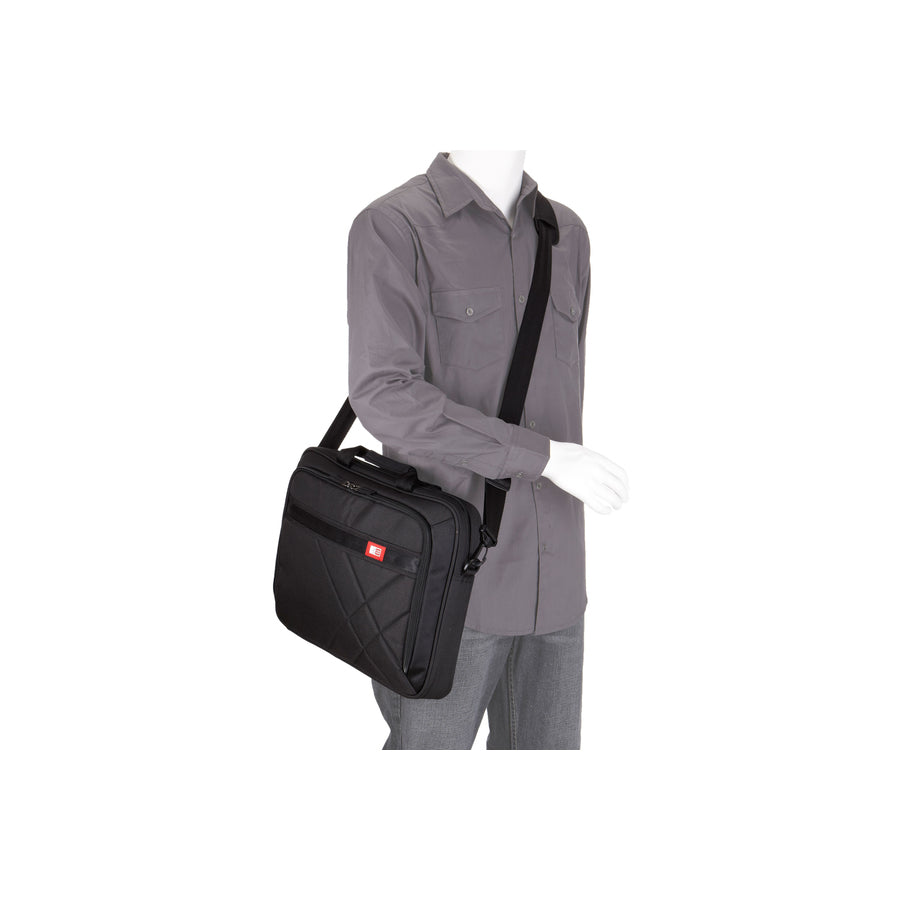 Modernized for today's casual professional, this asymmetrically quilted case carries a laptop, tablet and your business needs within a deep black exterior highlighted with red accents.