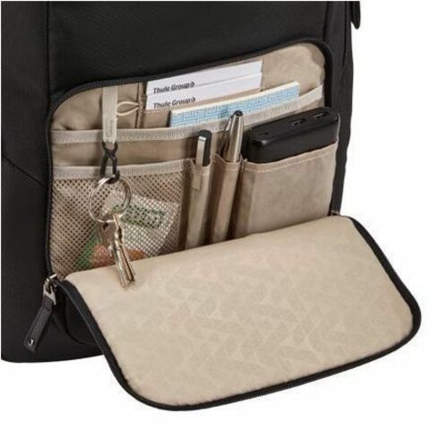 - Padded organization panel with multiple storage options for small electronics, cords, accessories, business cards and keys
