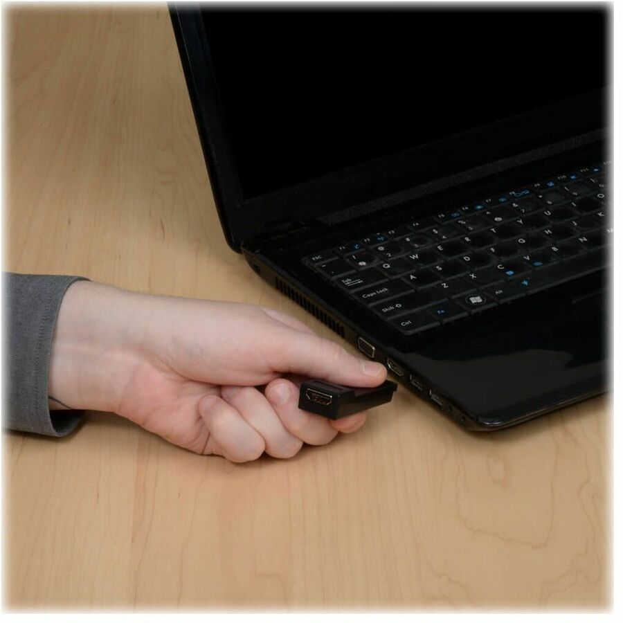 DisplayPort to HDMI video adapter lets you connect a computer with a DisplayPort output to an HDMI monitor. Gold-plated connectors provide optimal signal transfer for clearer resolution. Fully molded design is durably constructed to provide long-lasting use. Compact size is small enough to carry in your pocket, backpack or laptop bag for easy transportation. Adapter supports computer video resolutions up to 1920 x 1200 and HD resolutions up to 1080p. Plus, it supports DTS HD, Dolby True HD and 7.1 channel surround sound audio. Adapter requires that the connected computer is equipped with a DP++ (DisplayPort++) port.