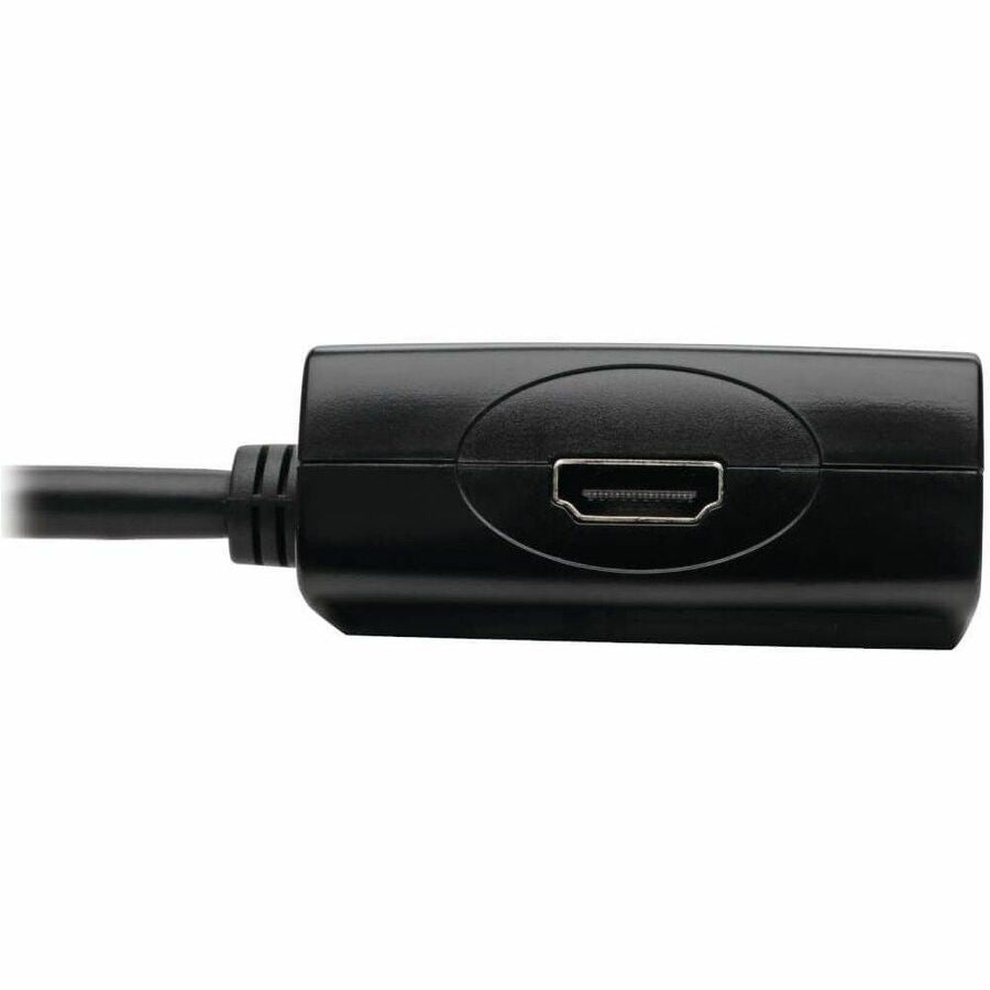 The transmitter's built-in HDMI cable connects to the audio/video source, and the receiver's built-in HDMI cable connects to the display. Cat5e/6 cable connects the two units (for best results, use 24 AWG solid-wire Cat5e/6 cable, such as Tripp Lite's N202-Series). Each unit is powered by an included USB Micro-B to USB-A cable, which must be connected between the unit and a USB port on the source device, display or USB wall charger. You can also connect an optional HDMI monitor to the transmitter's local port with a user-supplied HDMI cable, such as Tripp Lite's P568-Series.