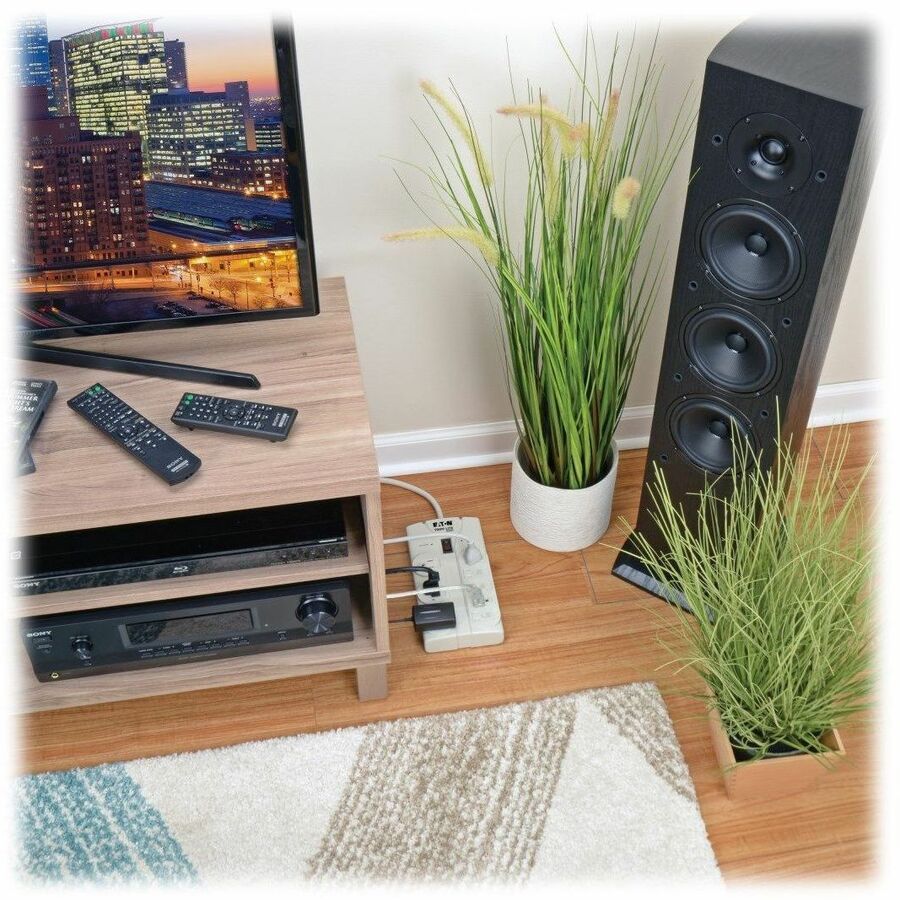 Surge protector is designed to protect electronic equipment against surges, spikes and line noise. Design accommodates bulky transformers without blocking remaining outlets. LEDs warn of potential power problems. Lighted power switch with integrated 15 amp circuit breaker offers power control and overload protection. Surge protector also features 8 outlets, an 8' cord with space-saving angle plug, and integrated child-safety sliding outlet covers. 1440 joules AC surge suppression shields equipment from the strongest surges and line noise.