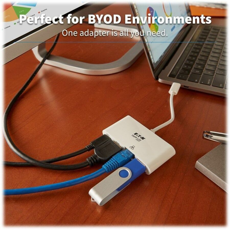 USB 3.1, generation 1 USB-C to HDMI 4K adapter expands the potential of your tablet, laptop, Chromebook, MacBook, smartphone or PC's USB-C or Thunderbolt 3 port. Plug-and-play technology makes installation quick and simple - with no software or drivers to install. Fumble-free, reversible USB-C plug connects in either direction for a quick connection every time. To send digital audio and HD video to an HDMI TV, projector or monitor, connect the HDMI port to the display using an HDMI cable (sold separately). The HDMI port supports UHD video resolutions up to 3840 x 2160 (4K x 2K) at 30 Hz. Adapter is perfect for transmitting digital audio and 4K video to a large display, adding a thumb drive or other USB peripheral, powering and charging a PD Charging-compliant mobile device, and connecting to a Gigabit Ethernet network all at the same time.