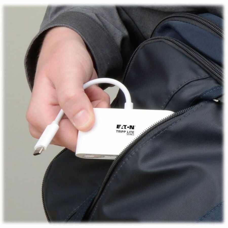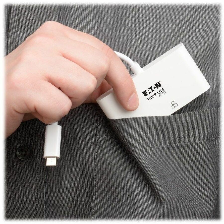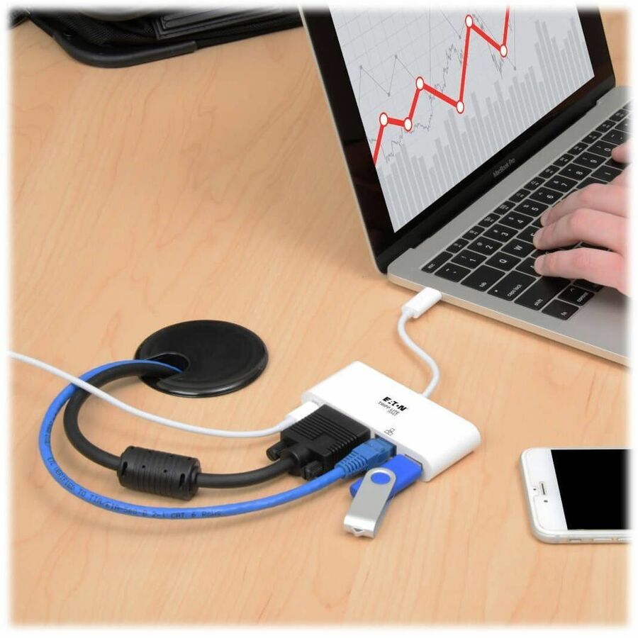 USB 3.1, generation 1 USB-C to VGA adapter expands the potential of your tablet, laptop, Chromebook, MacBook, smartphone or PC's USB-C or Thunderbolt 3 port. Plug-and-play technology makes installation quick and simple - with no software or drivers to install. Fumble-free, reversible USB-C plug connects in either direction for a quick connection every time. To send HD video to a VGA TV, projector or monitor, connect the VGA port to the display using a VGA cable (sold separately). The VGA port supports HD video resolutions up to 1920 x 1080 (1080p) at 60 Hz. Adapter is perfect for transmitting 1080p video to a large display, adding a thumb drive or other USB peripheral, powering and charging a PD Charging-compliant mobile device, and connecting to a Gigabit Ethernet network all at the same time.