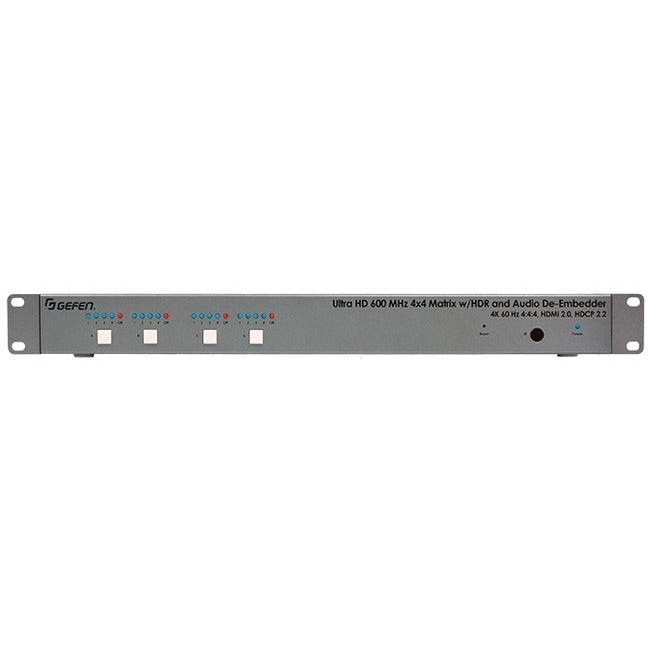 Designing systems capable of distributing 4K Ultra High Definition media requires support for the content of today, and headroom for the content of tomorrow. The Gefen 4K Ultra HD 600 MHz 4x4 Matrix for HDMI routes signal from up to four 4K sources to up to four 4K displays or video zones. Reinforcing its commitment to provide commercial integrators with cutting-edge audio/video signal processing solutions, Gefen's Ultra HD 600MHz Series 4x4 matrix supports 18.2 Gbps of bandwidth and 600 MHz TMDS Clock frequency, the highest specified under the HDMI 2.0 standard. The Gefen EXT-UHD600A-44 features a 1U tall, rack-mountable enclosure that can also be placed on a shelf. It accommodates Gefen locking HDMI cables to ensure secure connections.