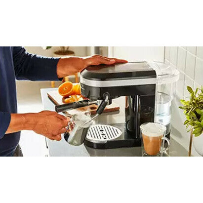 Enjoy espressos, lattes and cappuccinos, just the way you like, with the KitchenAid® Metal Semi-Automatic Espresso Machine. This is the first residential espresso machine that features dual, smart temperature sensors, that maintain the perfect brewing temperature shot after shot. The fast-heating thermocoil technology heats water up to the ideal brewing temperature in less 45 seconds. And, the low pressure pre-infusion and 15-bar Italian pump work together to make a deliciously rich, thick crema.