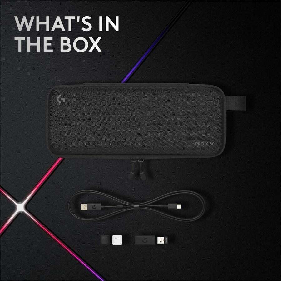 • Contents: PRO X 60 Wireless Gaming Keyboard, USB LIGHTSPEED wireless adapter, USB-A to USB-C charging and data cable (6 ft./1.8 m), Logitech G keycap, carrying case and user documentation"