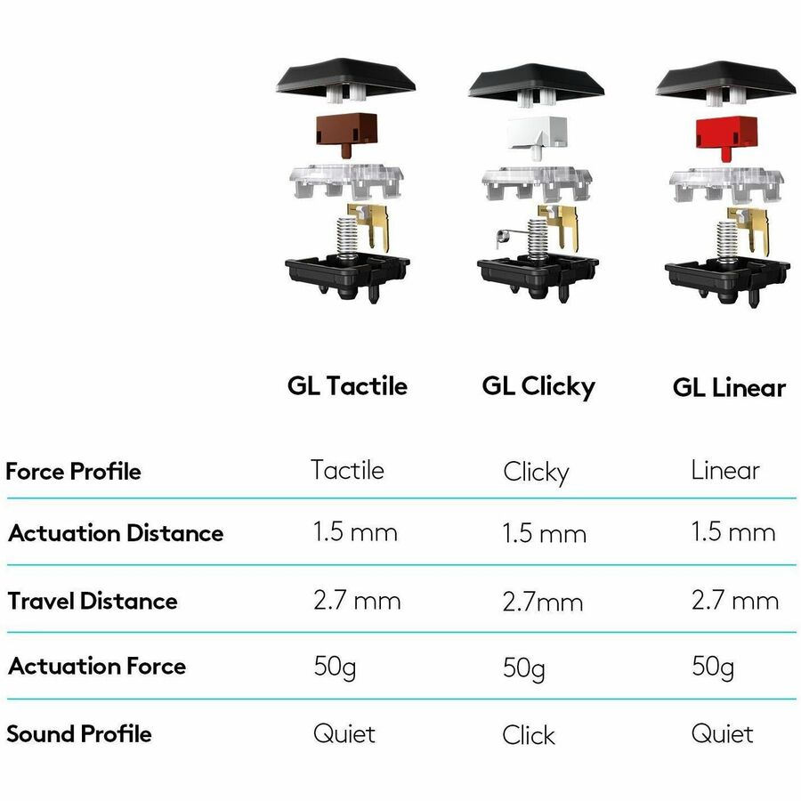- Low Profile mechanical switches offers the speed, accuracy and performance of a mechanical switch at half the height. The GL Clicky switch features a distinctive sound and tactile feedback. Comes in 3 options: GL Tactile, GL Linear or GL Clicky.