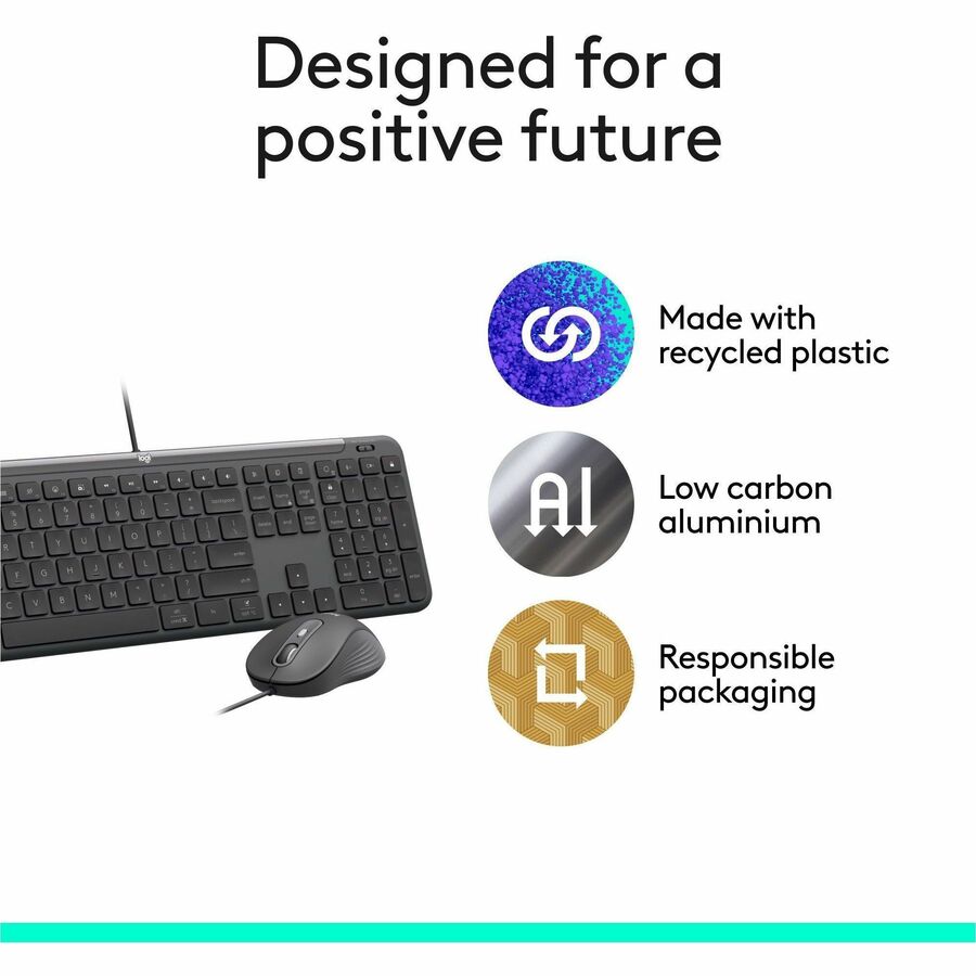 Designed for workplaces that require wired solutions, Signature Slim Wired Combo MK625 for Business offers an improved experience for everyone. The keyboard delivers high-quality typing with laptop-style keys, thoughtfully designed with a subtle scoop for typing precision. Elevate productivity with AI Launch Key for accessing AI tools or meeting control keys to mute yourself or turn off the video. The ambidextrous mouse offers line-by-line or super fast scrolling with SmartWheel technology. Both devices are customizable with Logi Tune and work with multiple OS platforms. Designed for sustainability, the plastic parts are made from a minimum of 66% post-consumer recycled plastic.