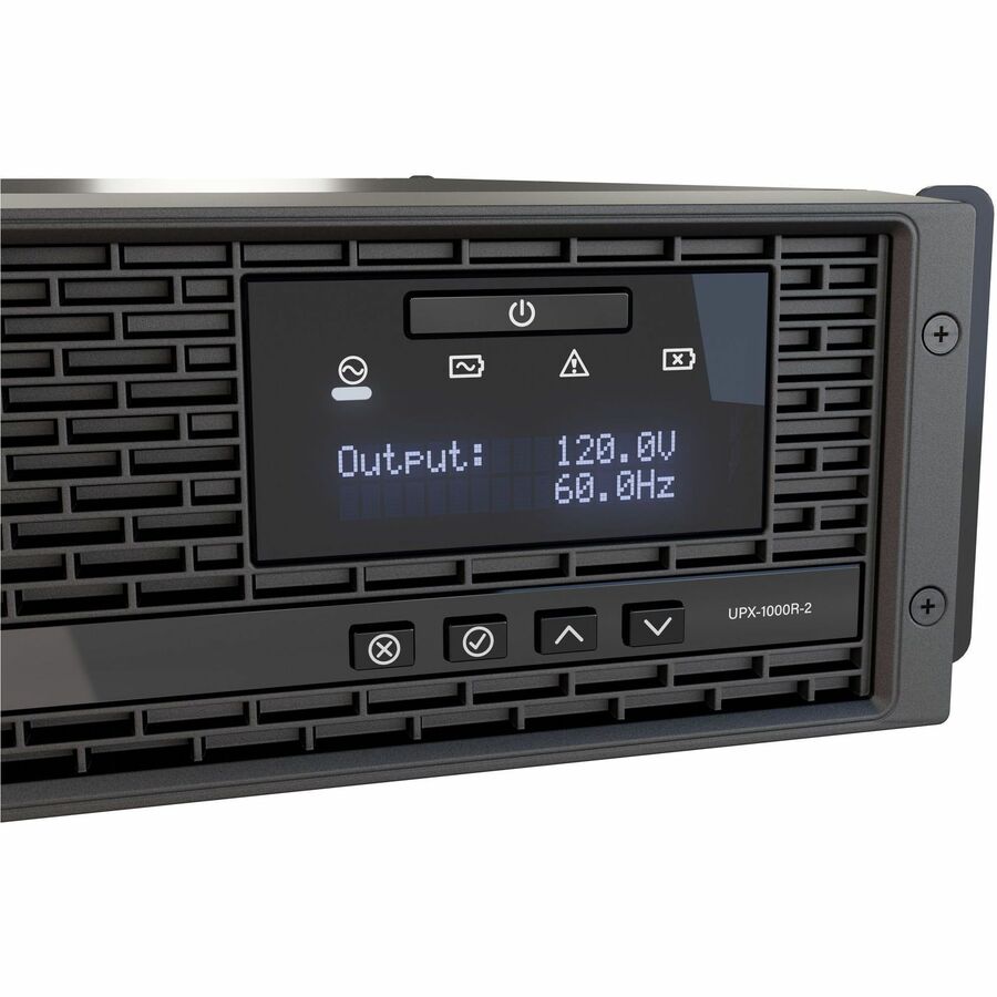 - Front panel LCD screen shows UPS Device Name, Model Number, Serial Number, Replacement Battery Number, Battery Install Date, Firmware Version and where applicable, RackLink Network card IP address and MAC address