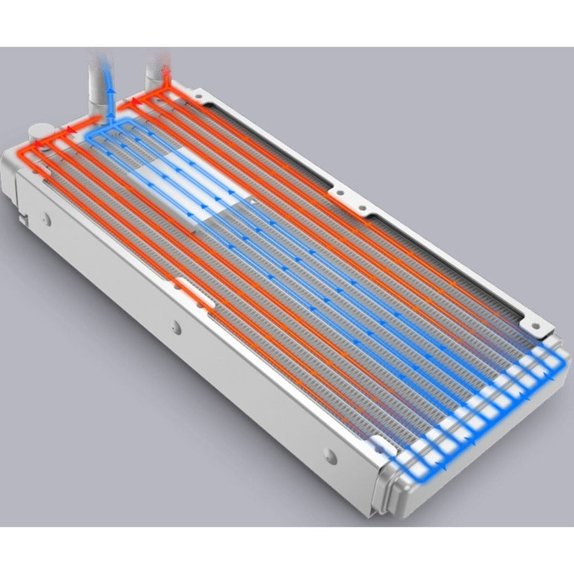 A split pathway through the radiator rapidly dissipates heat, cooled liquid is then pumped back into the loop.