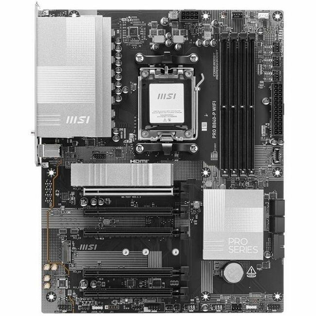 PRO B840-P WIFI offers a simple design with a harmonious silver color scheme that perfectly matches both white and black PC builds. It is engineered with many exclusive features of MSI, a true Wi-Fi 7 with EZ Antenna, 2.5G LAN, and PCIe 4.0 M.2 with EZ M.2 Shield Frozr II, ready for the AMD Ryzen 9000 series processors..