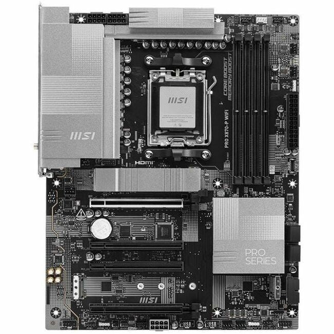 PRO X870-P WIFI offers a simple design with a harmonious silver color scheme that perfectly matches both white and black PC builds. It is engineered with many exclusive features of MSI, a true Wi-Fi 7 with EZ Antenna, 5G LAN, PCIe 5.0 M.2 with EZ M.2 Shield Frozr II, and Supplemental PCIe Power, ready for the AMD Ryzen™ 9000 series processors.