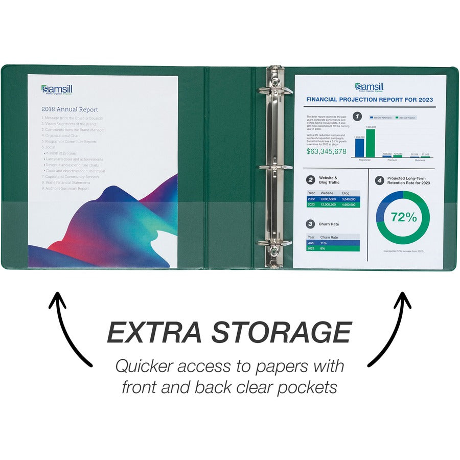 Durable, three-ring View Binder is ideal for daily use at your home, school or office. Binder is made with polypropylene and chipboard and features a clear overlay with a nonglare finish. PVC-free, nonstick material won't transfer ink or lift copy from materials inserted into the cover or placed inside the binder. Lid-mounted, D-shaped rings create a rivetless spine to a professional look that impresses during presentations. The 2" binder holds up to 475 sheets to keep all your documents in one, convenient place for easy organization.
