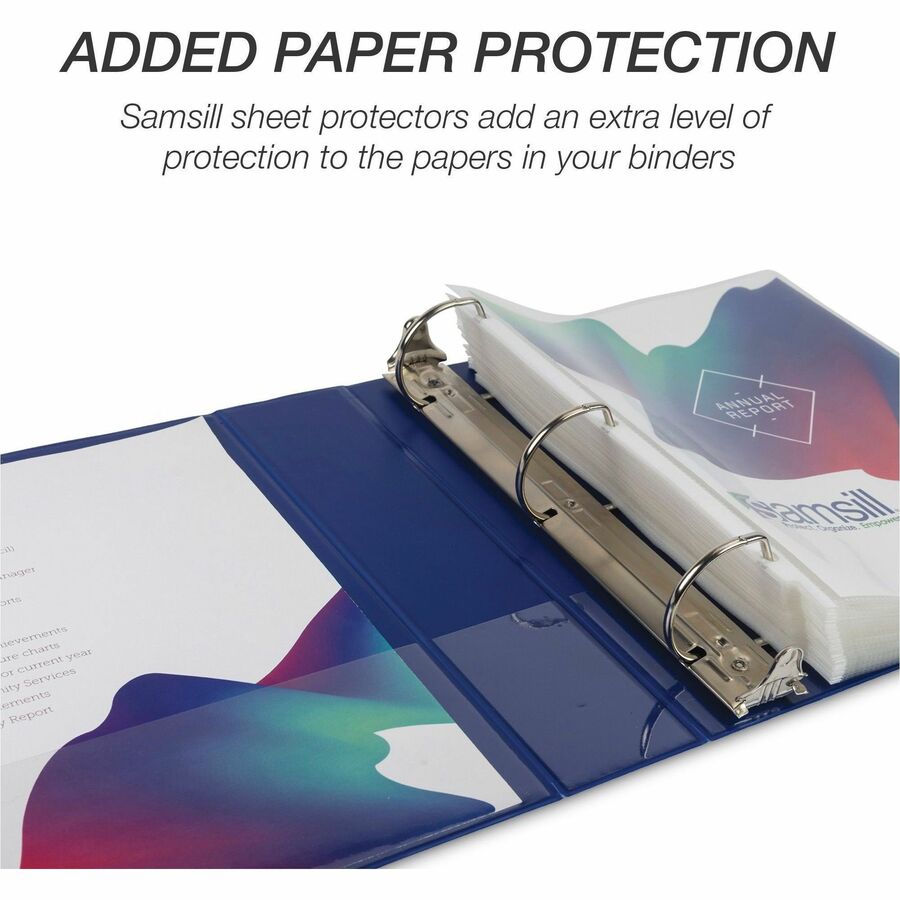 Durable, three-ring View Binder is ideal for daily use at your home, school or office. Binder is made with polypropylene and chipboard and features a clear overlay with a nonglare finish. PVC-free, nonstick material won't transfer ink or lift copy from materials inserted into the cover or placed inside the binder. Lid-mounted, D-shaped rings create a rivetless spine to a professional look that impresses during presentations. The 2" binder holds up to 475 sheets to keep all your documents in one, convenient place for easy organization.