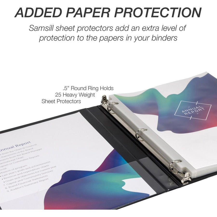Samsill's three ring binders make indispensable home, office, and school supplies. While many binders are available, our multipurpose business and school binder offers the economical paper storage and organizational value you've been searching for. This important document binder features a clear overlay along the front, back, and spine, allowing you to customize your presentations, projects, and more. Non-stick materials are used to make this product, which prevents ink transfer or lifting copy when materials are inserted into the cover or placed inside. Three binder rings with double boosters hold up to 100 - 8.5 by 11 inch letter-sized sheets with ease. The rings are mounted on the back lid, allowing pages to lay flat while preventing wear and tear on documents. 2 clear interior pockets provide additional storage with enough space for notes, photos, business cards, or full-size pages. Get crafty with our ring binders and create a baseball card binder, portfolio binder, recipe binder, trading card binder, savings binder, etc. The possibilities are endless!