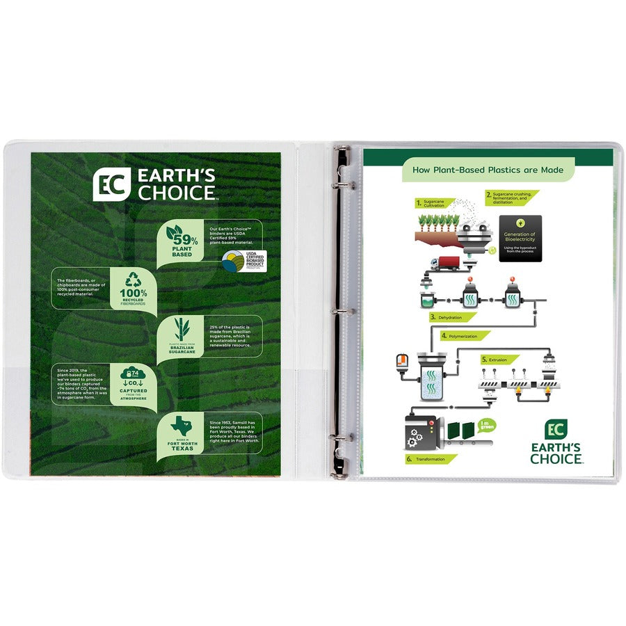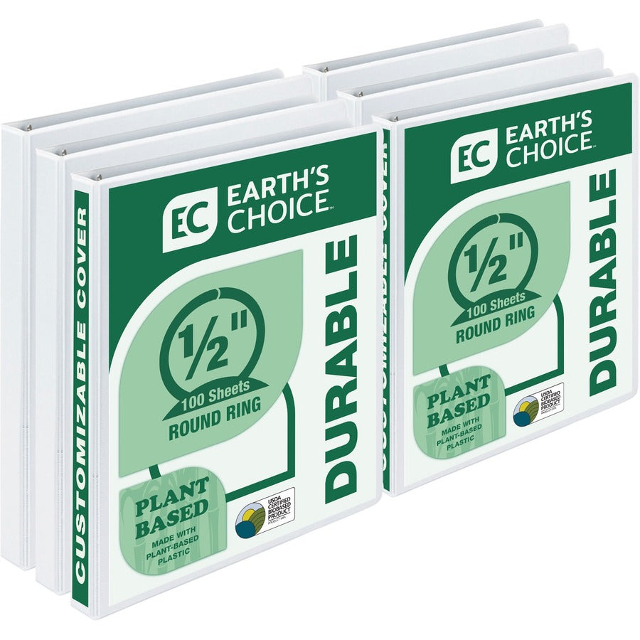 The first and only biobased presentation view binders are durable and can be used for storing documents and loose items with considerable ease for the perfect counter organizer. 3 round rings are mounted on the back lid which allows pages to lay flat and prevent wear and tear of the documents. Such a construction also adds to a sleek, clean appearance with no-rivet spine. This .5 inch 3-ring binder can comfortably hold up to 100 sheets of three-hole-punched paper (sheet size: 8.5x11). The rings are sturdy to withstand years of use and easy to open and close. It features two clear inside horizontal pockets for additional storage and organization of loose documents and non-punched papers. Each pocket provides enough space to hold notes, photos, business cards, or full-size pages that will be punched later. Non-stick materials are used for making this product, which prevents transfer of ink or lifting copy when materials are inserted in the cover or placed inside. A clear overlay on the front, back, and spine of the binder gives full control and flexibility over customization of presentations, organizational projects, office reports, class projects, and more. Order multiple binders to create a custom desk reference system for weekly or monthly office reports, multiple classes at school, or other unique personal or professional projects. The premium grade plastic covering tightly sealed onto thick, sturdy chipboard offers it long-lasting durability with a lifetime product guarantee.