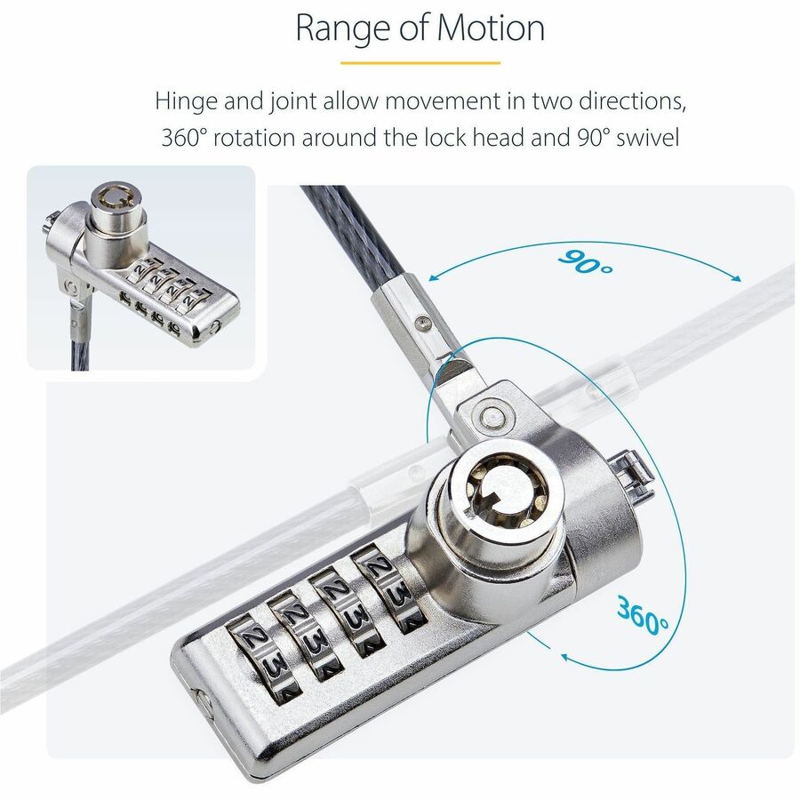 The hinge allows movement in two directions - 360-degree rotation around the lock head and 90-degree swivel, allowing a laptop, dock or other device to move freely and providing added convenience when locking or unlocking.
