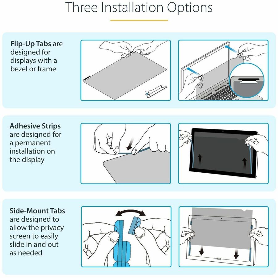 Hassle-free InstallationInstall the privacy screen protector using the included adhesive strips or flip-up tabs. This unit is designed for use with displays that have raised bezels.