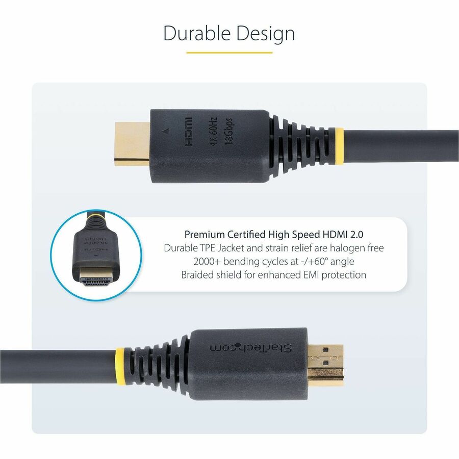 Durable DesignThis High Speed HDMI Cable features a flexible TPE outer jacket that is tested to withstand 2,000 bending cycles at -/+60 degrees, and routes easily around corners and desk edges. Robust strain reliefs enable convenient positioning of the cable. The durable Gold-plated connectors are rated to operate beyond 10,000 insertions.