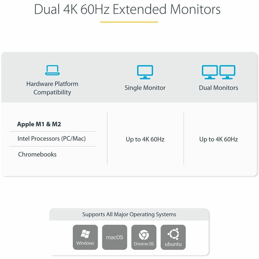 The Dock is DisplayLink Certified, for Plug and Display compatibility with Windows, ChromeOS, and macOS, enabling operation and switching between multiple computers with different operating systems. DisplayLink technology also supports extended dual displays on Apple M1/M2/M3 MacBook which are not natively capable of driving more than one external display. The DisplayLink Certification ensures support for resolutions up to 4K 60Hz on both external displays.