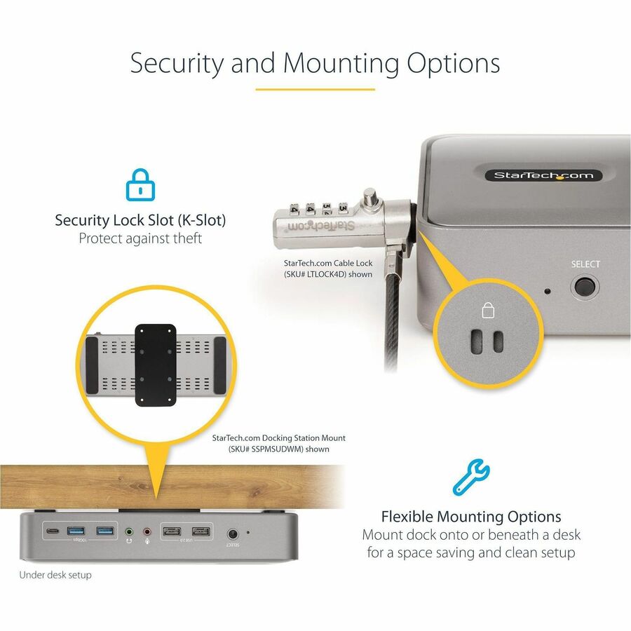 The Dock features a mounting pattern so it can be mounted when paired with StarTech.com mounting accessories (sold separately). Our mounting accessories enable mounting to the VESA pattern on the back of a monitor or to any flat surface. The following mounts are compatible with this product: