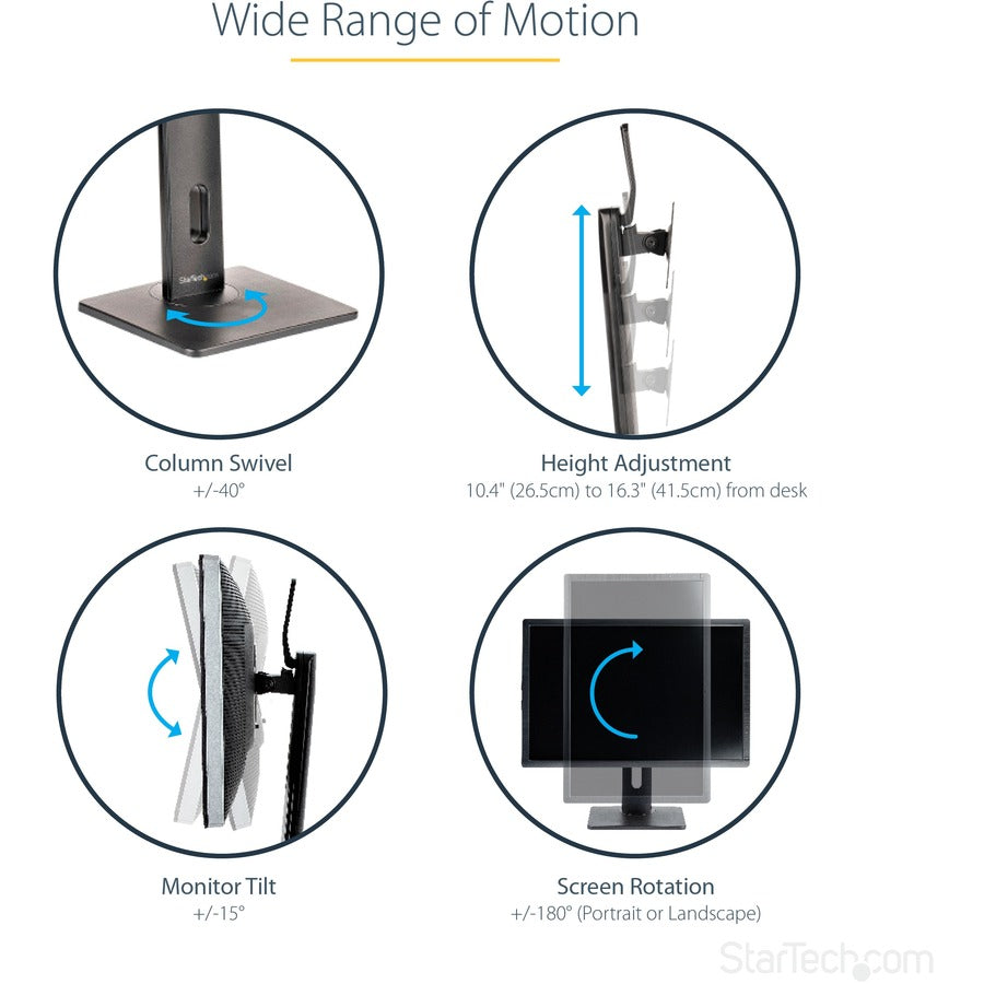 - RANGE OF MOTION: Ergonomic monitor mount increases comfort & productivity with +/-15° tilt, +/-180° screen rotation (portrait/landscape); Entire column swivels +/-40°