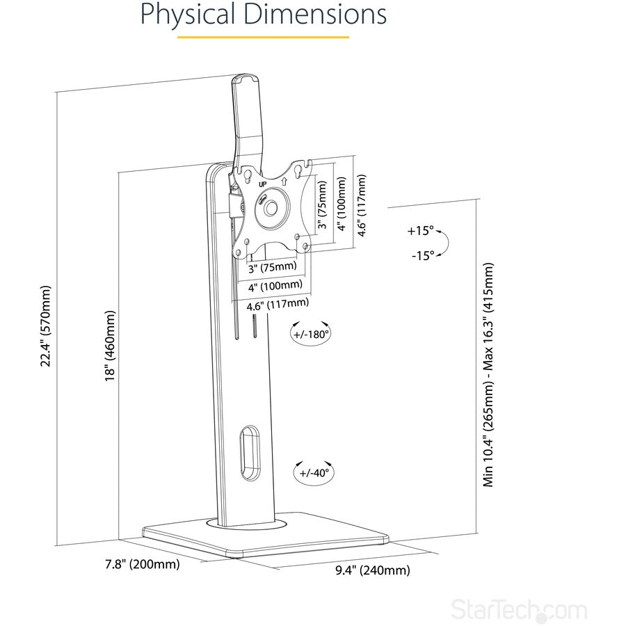 The free-standing monitor stand features a wide range of motion so you can position your monitor to the ideal viewing angle, allowing you to work more comfortably and reduce eye and neck strain. You can easily tilt +/-15°; swivel +/-180°; and make height adjustments to fully adjust your monitor so it can meet your ergonomic needs. With a rotating base, this monitor stand lets you swivel your display a total range of +/- 40°.