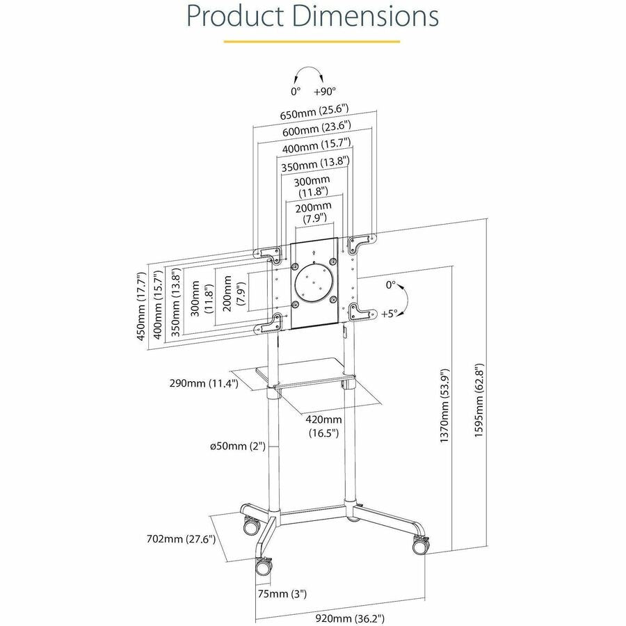 - EASILY ADJUSTABLE: Movable rolling TV stand/cart positions the center of your display at 53.9" (137cm) from the floor; Tilt 0/+5°; +/-90° rotation allows the display/flat screen to be easily adjusted locked in portrait or landscape position
