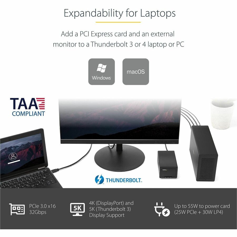 This Thunderbolt™3 PCIe expansion chassis lets you add a PCI Express card to your laptop or desktop computer, through an external Thunderbolt 3 connection. The chassis also features a DisplayPort video output, so you can connect an additional monitor to your laptop, and supports Thunderbolt 3 daisy chaining, so you can expand your workstation even further.