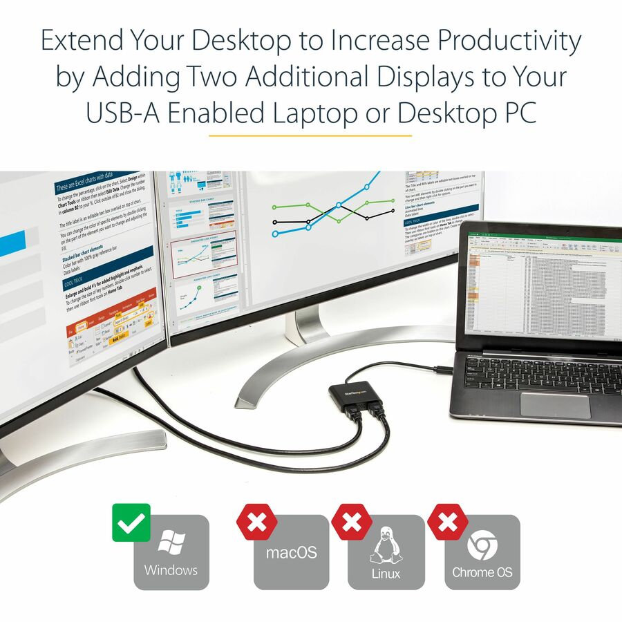- WINDOWS ONLY: USB-A to dual HDMI adapter is only compatible w/ Windows; Does not support macOS or Linux; USB 3.0 Graphics Card Adapter to connect multiple screens; This USB video adapter is not intended for graphical intensive applications, such as gaming
