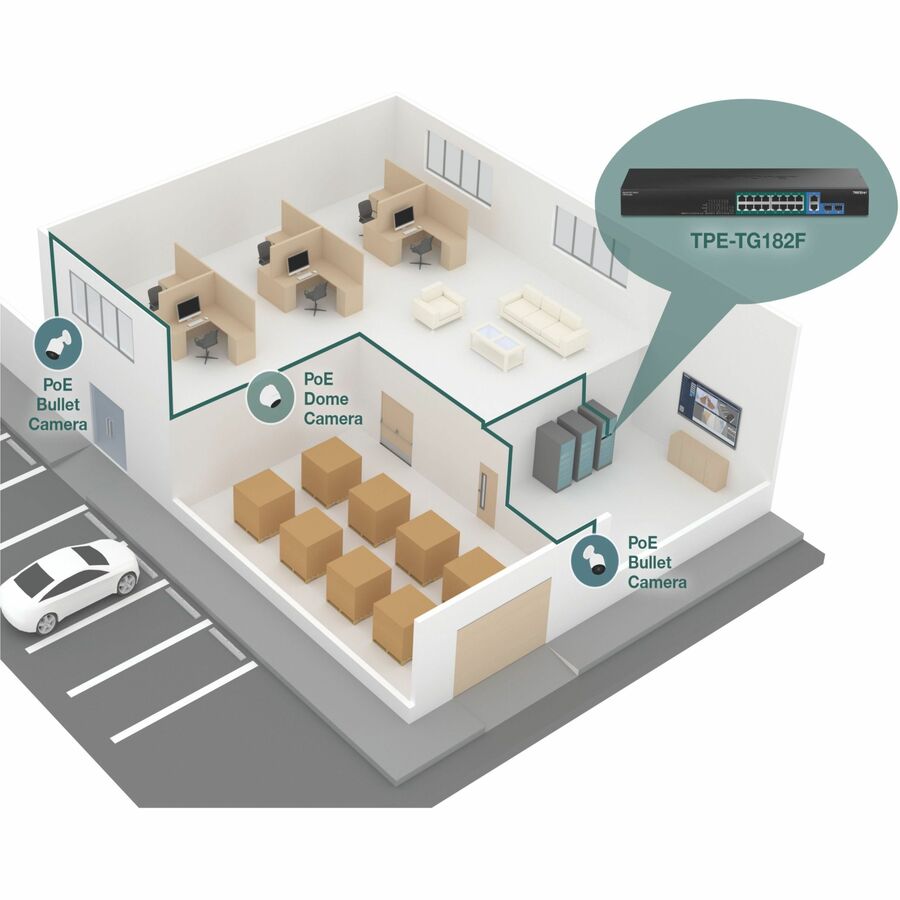 TRENDnet's 18-Port Gigabit High-Power PoE+ Switch, model TPE-TG182F, reduces equipment and installation costs by delivering data and power over existing Ethernet cables. This rack mountable, high-power PoE switch provides 16 gigabit PoE+ ports with a total PoE power budget of 440W. It also features two additional shared RJ-45 or SFP gigabit ports. The TPE-TG182F high-power PoE+ switch supplies up to 30W of power per port for devices such as high-power wireless access points, PTZ (Pan/Tilt/Zoom) IP cameras, and other PoE+ systems.