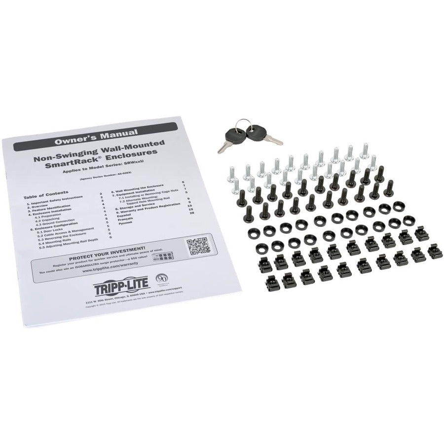 The SRW12UG comes fully assembled and ready to mount to the wall, or use Tripp Lite's optional SRCASTER rolling caster kit to make it a mobile rack. Square and threaded mounting holes and numbered rack spaces make equipment installation easy. The vertical mounting rails adjust in 7/8-inch increments to accommodate equipment up to 16.5 inches deep, such as network switches and patch panels.