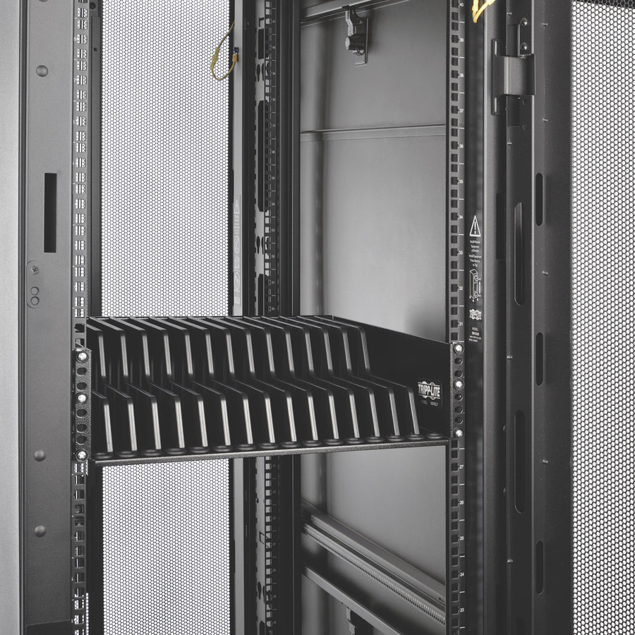 Compatible with all EIA-compliant 19-inch wall-mount and floor rack enclosures, the SR16SHELF is covered in non-scuff paint designed to resist scratches. The devices' charging cables pass through ports with rubber grommets that hold the cable in place and prevent clutter and tangles. All mounting hardware included. Mounts into 3U of rack space, but may require additional rack space depending on the size of the devices being stored.