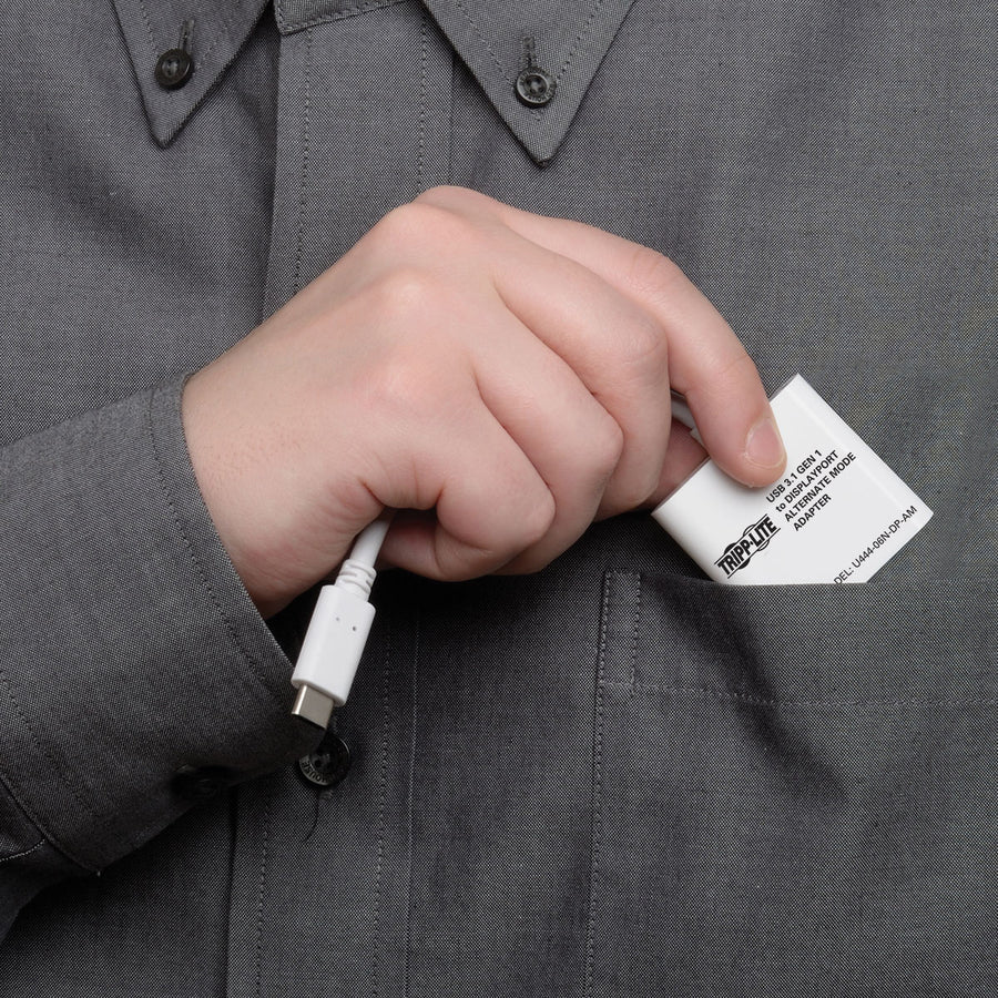 The plug-and-play U444-06N-DP-AM requires no software, drivers or external power. Connect the reversible USB-C plug to your source device's USB-C or Thunderbolt 3 port. The fumble-free USB-C plug connects in either direction to ensure fast, easy connection every time. Then, connect the DisplayPort to your display using a DisplayPort cable (sold separately).