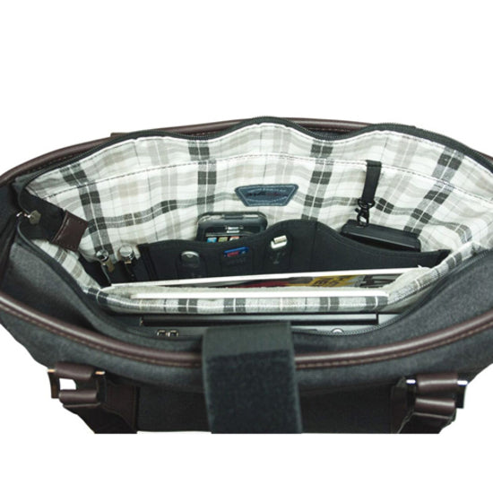 Our new Special Edition Urban Tote is the perfect companion for your daily commute to work or school or even occasional travel. This roomy tote can be used as a purse, a travel bag, a briefcase, or even a diaper bag! The Urban Tote is built with a lightweight yet durable cotton canvas with contrast vegan leather accents and trim and features a classic shape and design with dual top handles that make it easy to carry. The contemporary Charcoal color comes with your choice of black or brown trim. This tote bag has a large main compartment with a top zipper closure and a fully lined interior that includes separate padded pockets for your laptop and tablet. Additionally, there is an internal custom workstation with storage for pens, smartphone, flash drives and other accessories plus a handy key fob. A zippered exterior pocket provides secure storage for your phone or other quick access items. Open pockets on both ends of the bag hold your keys, water bottle and other miscellaneous items.