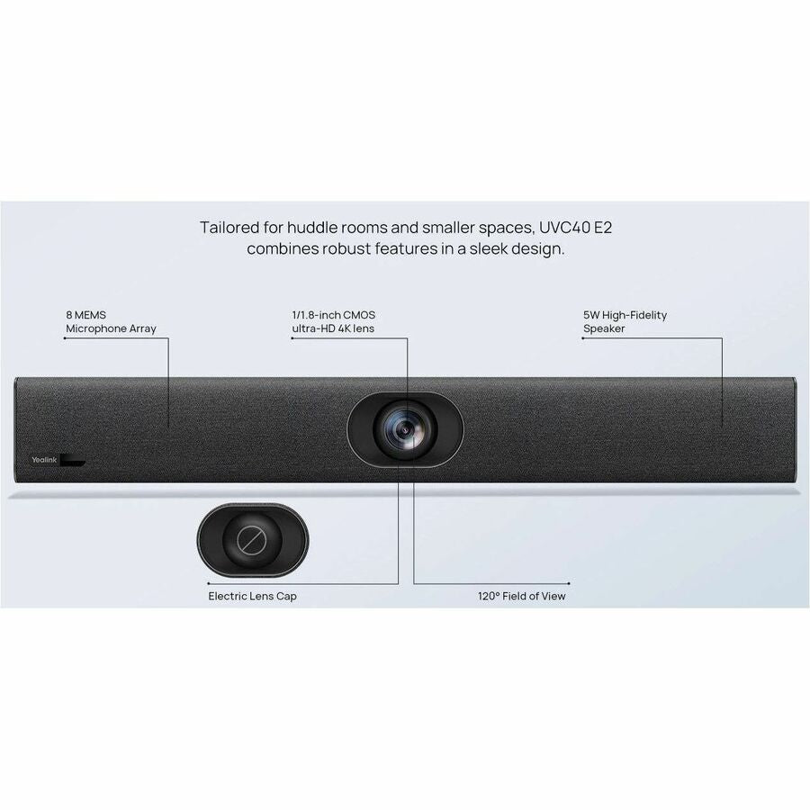 With 4K ultra-HD imaging, a 120° super-wide-angle lens and Smart Area Exposure technology, the UVC40 E2 ensuresexceptional video quality.AI featureslike Auto Framing and Speaker Tracking enhance conferencing, while 8 MEMS microphones and a high-fidelity speaker ensureexcellent call quality. Manageable via Yealink Device Management Platform , UVC40 E2 is your choice for seamless collaboration.